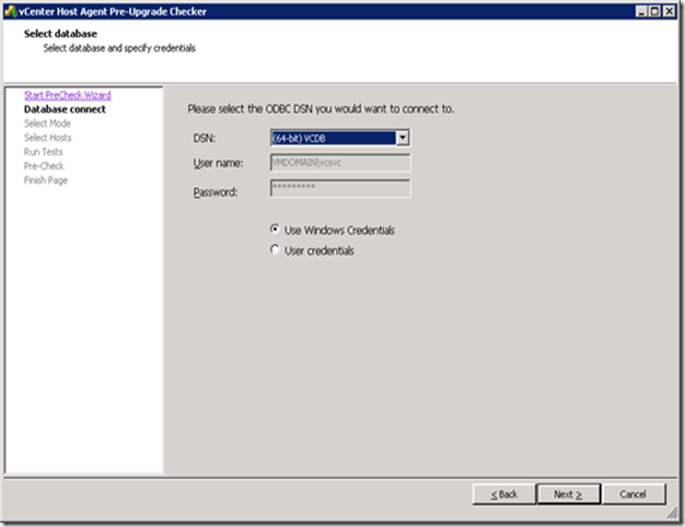 Clicked the Next button on the welcome screen to continue. On the Select database screen, select the DSN for the vCenter. I have chose to use Windows Credentials because the DSN was setup to use domain account and I and logon using that domain account (VMDOMAIN\vcsvc).